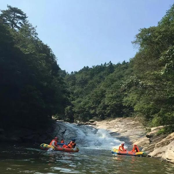 红安对天河探险漂流地处湖北省黄冈市红安县天台山国家森林公园内,河道全长5.8公里,上下游落差143米,漂流时间为1.5-2小时。景区内峡幽谷深、滩多浪急、古木参天、怪石林立、峭岩飞瀑、风光迷人。对天河漂流以其充足的水源保障、茂密的原始丛林风光、罕见的青石板漂流河床而彰显出与众不同的特点。
